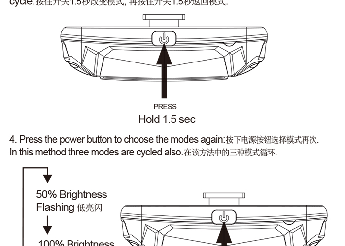 特性:LED技術(shù),COB整面發(fā)光30顆燈珠,高亮100流明設(shè)計(jì);配備USB接口,可循環(huán)充電;六種模式可循環(huán)切換;電池自動(dòng)保護(hù)功能,電壓低于2.8V不工作;硅膠捆扎固定方式,120度方位調(diào)整,方便拆卸安裝;方型背扣設(shè)計(jì),可橫向和縱向不同角度安裝;可安裝在坐管,下叉,車把手,前叉等。