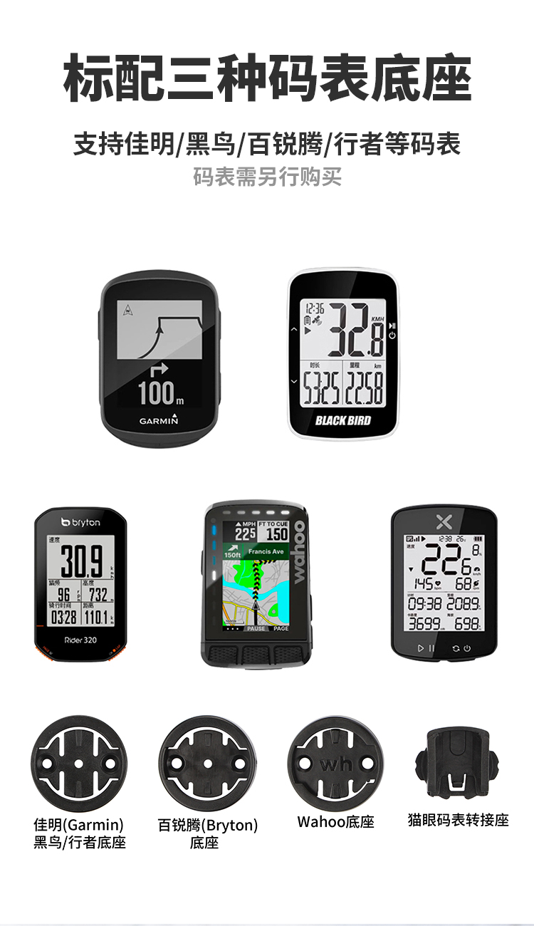 支持碼表:GARMIN全系列(兼用行者/黑鳥/iGPS等),貓眼全系列,百銳騰系列,wahoo系列