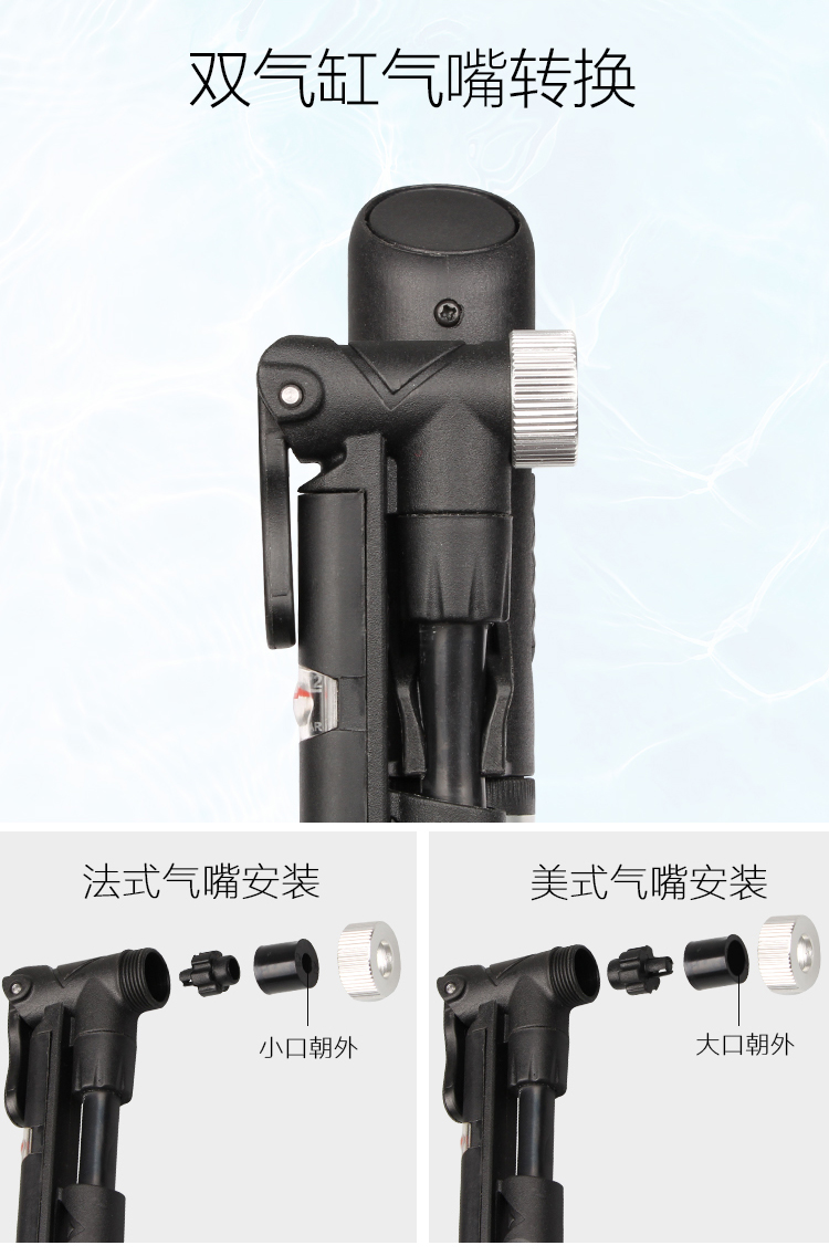 特點(diǎn):鋁合金氣缸,體積小不占地方,美嘴法嘴兼用,帶固定支架可安裝在車架上