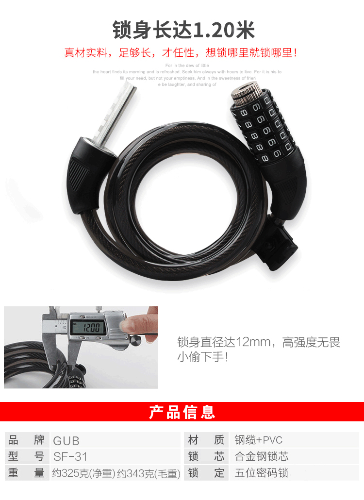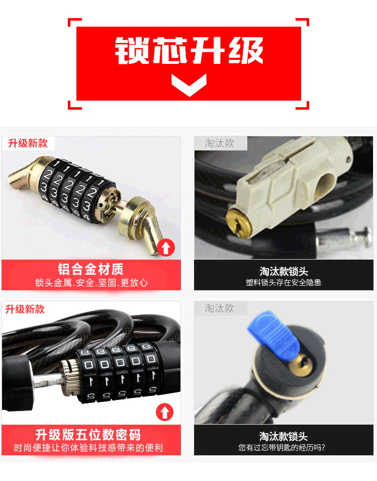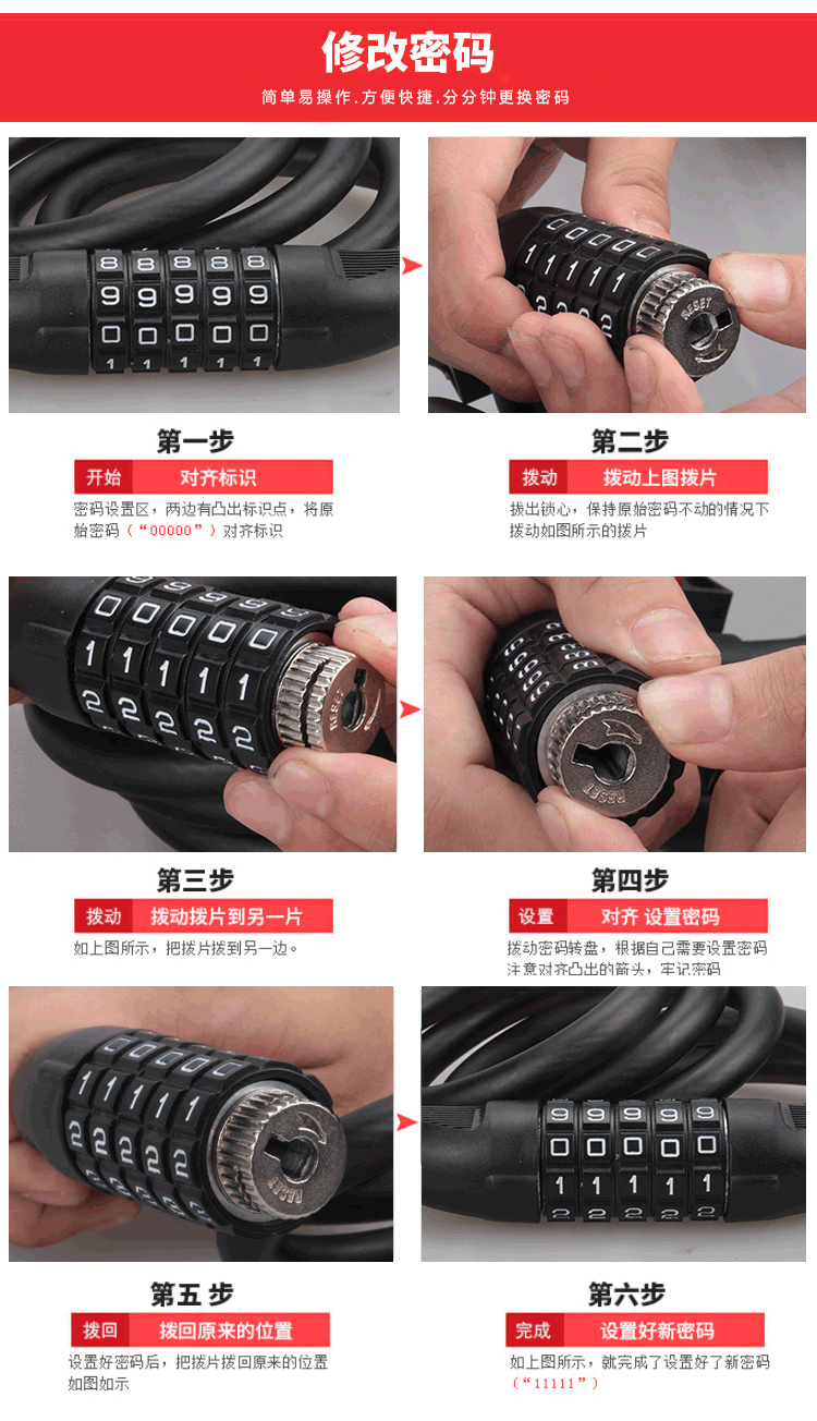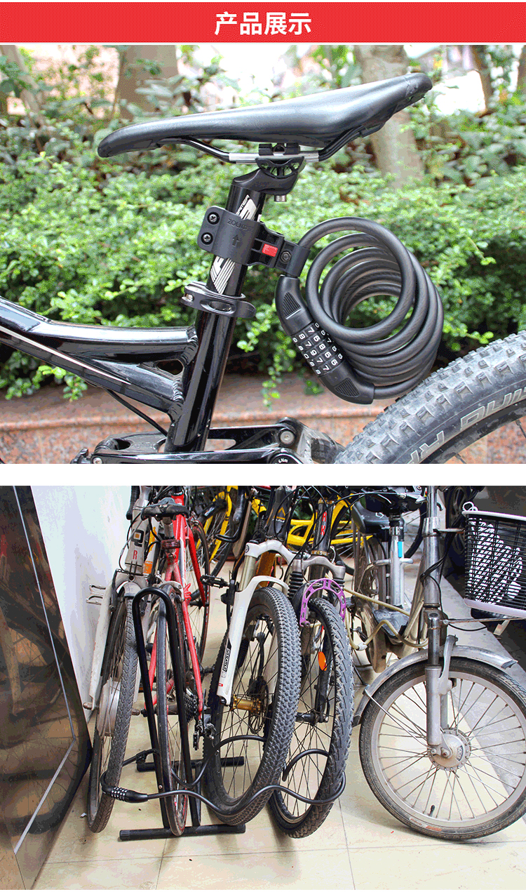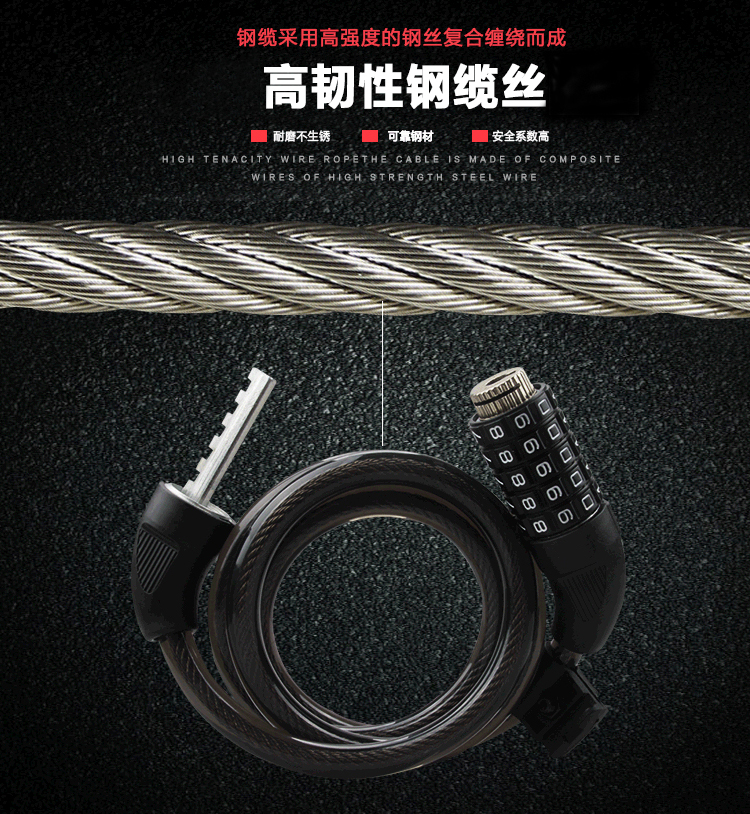 特色:五位數(shù)密碼鎖,時尚便捷免鑰匙,1.2米合金鋼纜想怎么鎖就怎么鎖,鋁合金鎖芯更牢固,帶鎖架方便使用