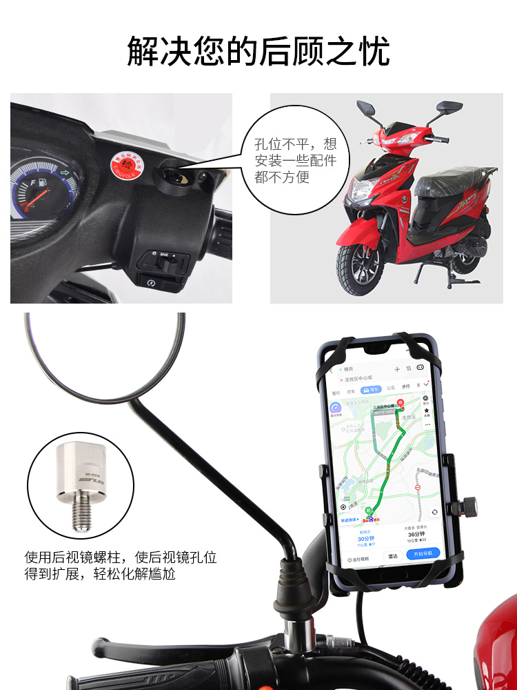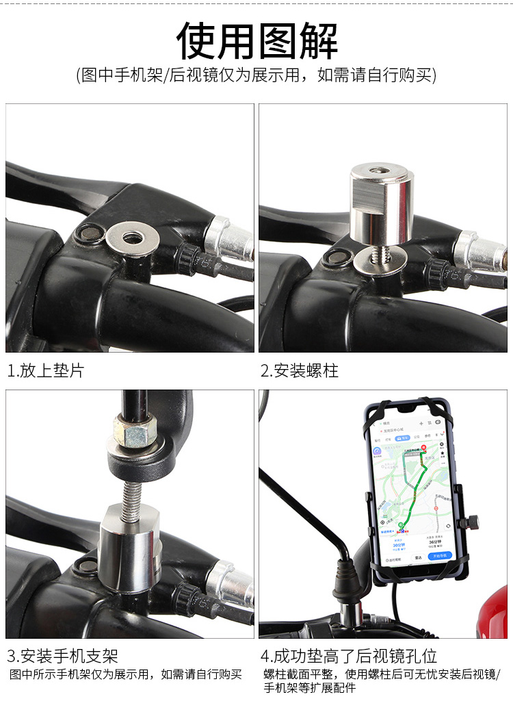 簡介:此配件為后視鏡輔助配件,采用不銹鋼材質(zhì),耐用不生銹,用于摩托車/電動車后視鏡孔位的擴(kuò)展,起到墊高或更好適配的作用。