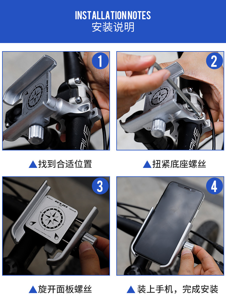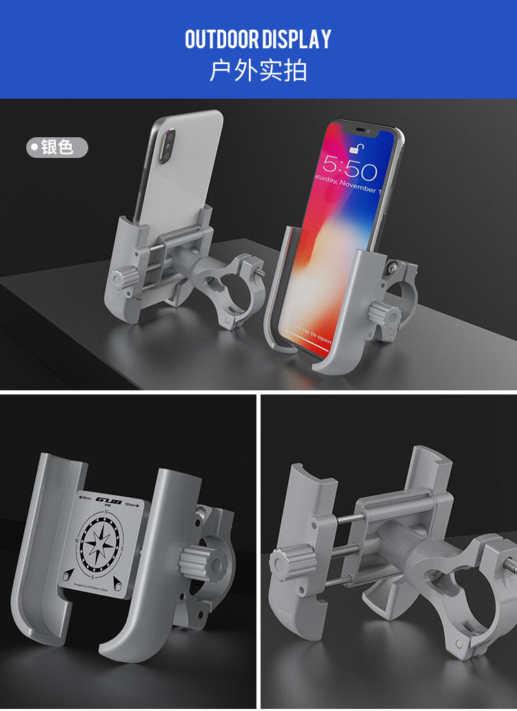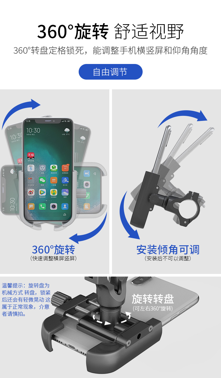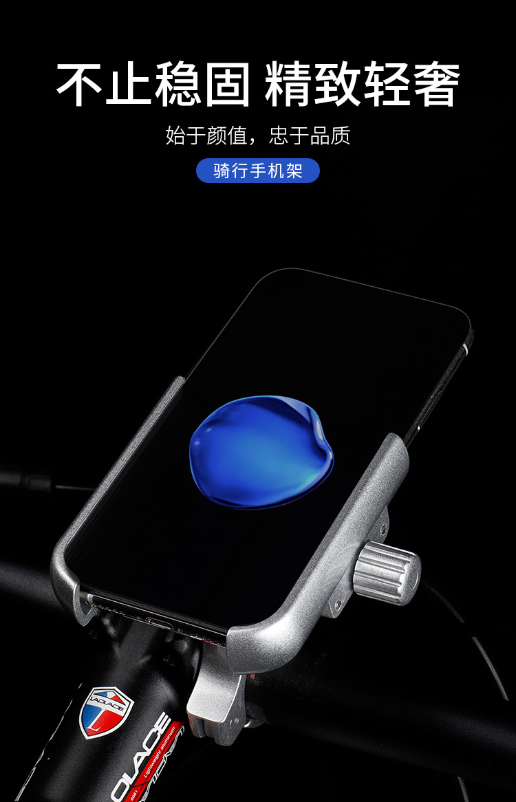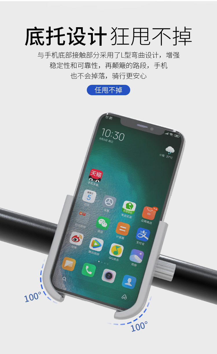 特點:全鋁合金架體,加厚加寬使用更安全。免工具平面360度旋轉(zhuǎn),高兼容性不挑手機型號,自行車、電動車等都可使用!