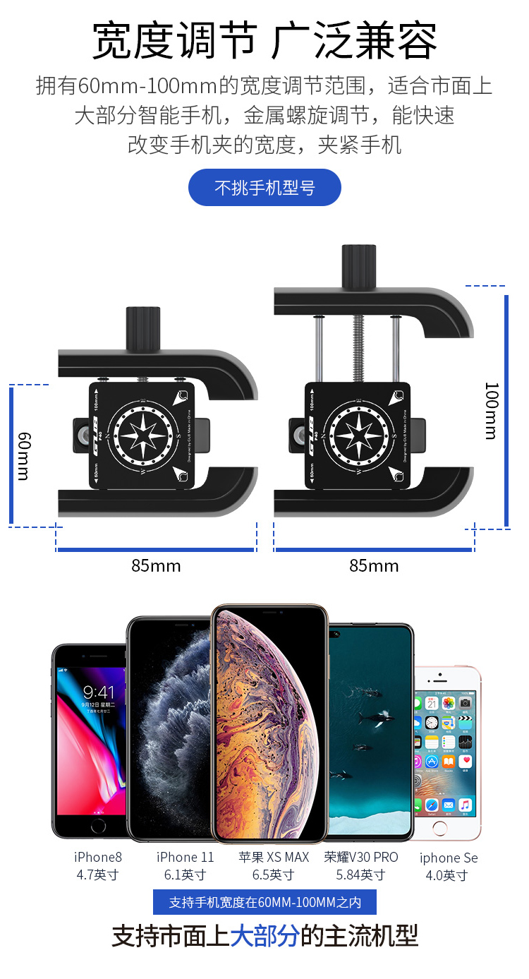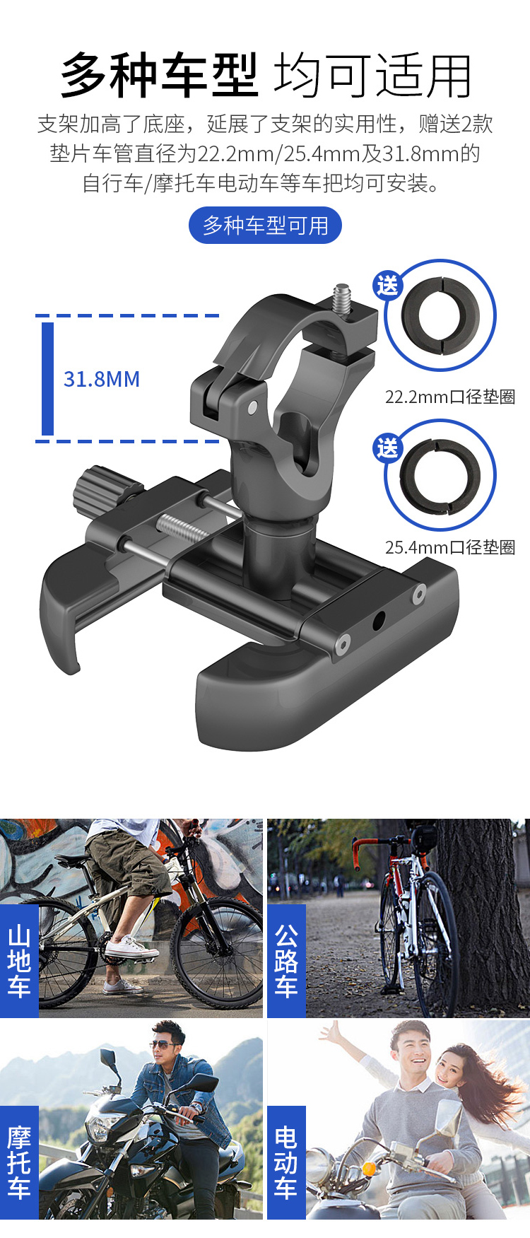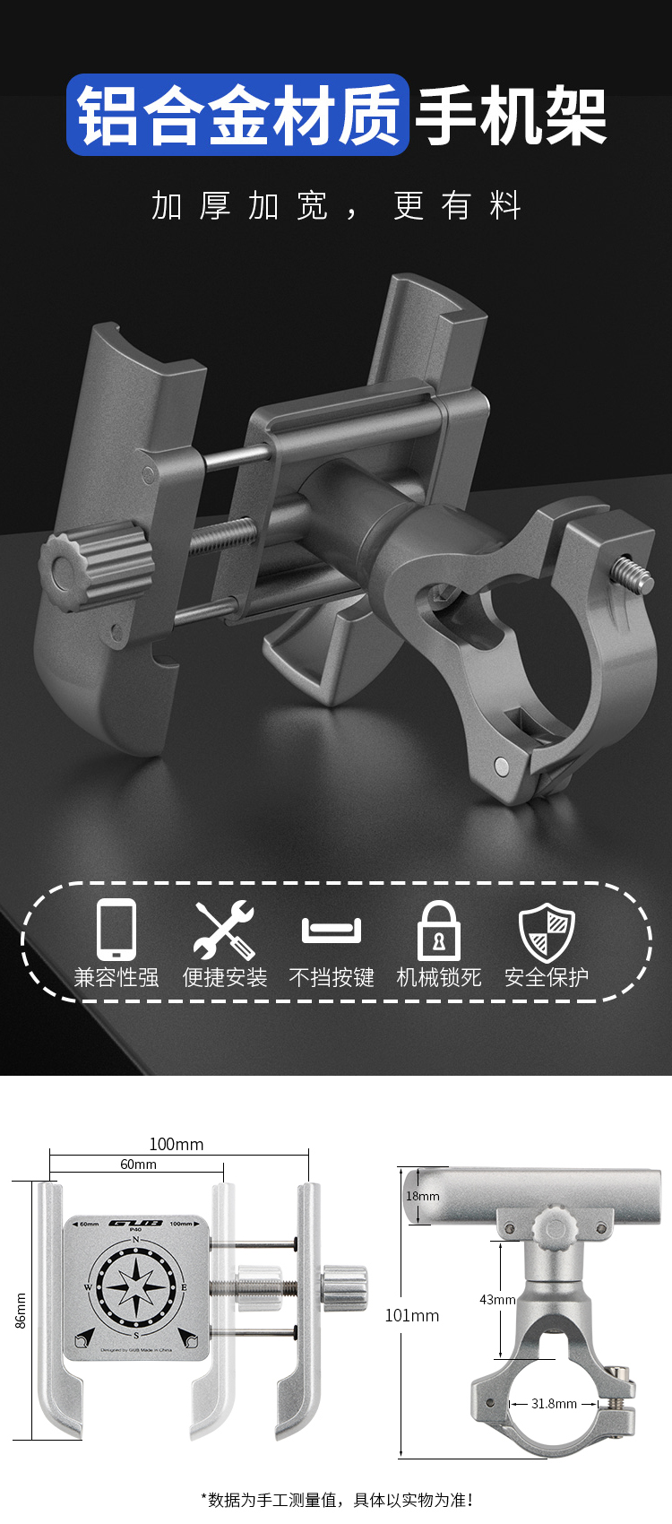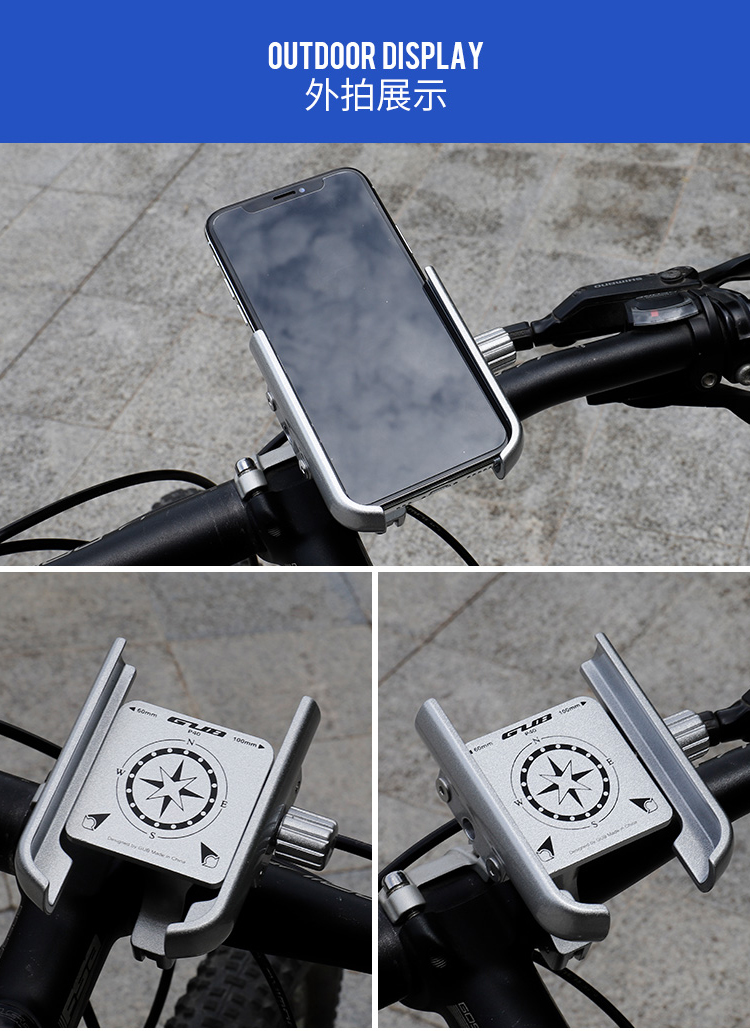 特點:全鋁合金架體,加厚加寬使用更安全。免工具平面360度旋轉(zhuǎn),高兼容性不挑手機型號,自行車、電動車等都可使用!
