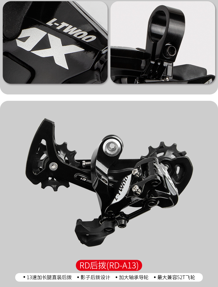 后撥:13速加長腿直裝后撥,影子后撥設計,加大軸承導輪,最大兼容52T飛輪