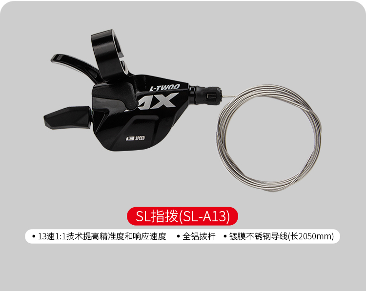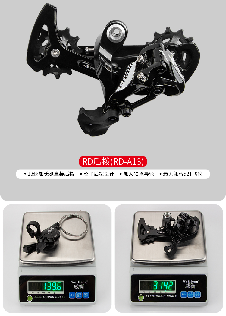 后撥:13速加長腿直裝后撥,影子后撥設計,加大軸承導輪,最大兼容52T飛輪