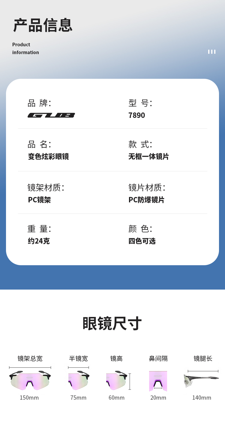 顏色:啞黑框腳/全面藍(lán)變色片、啞黑框腳/全面紫變色片、亮白框腳/全面藍(lán)變色片、亮白框腳/全面紫變色片