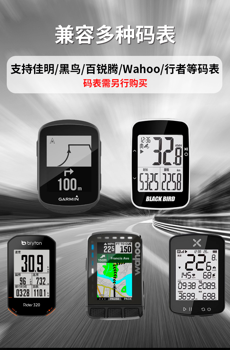 支持碼表:GARMIN全系列(兼用行者/黑鳥(niǎo)/iGPS等),貓眼全系列,百銳騰系列,wahoo系列