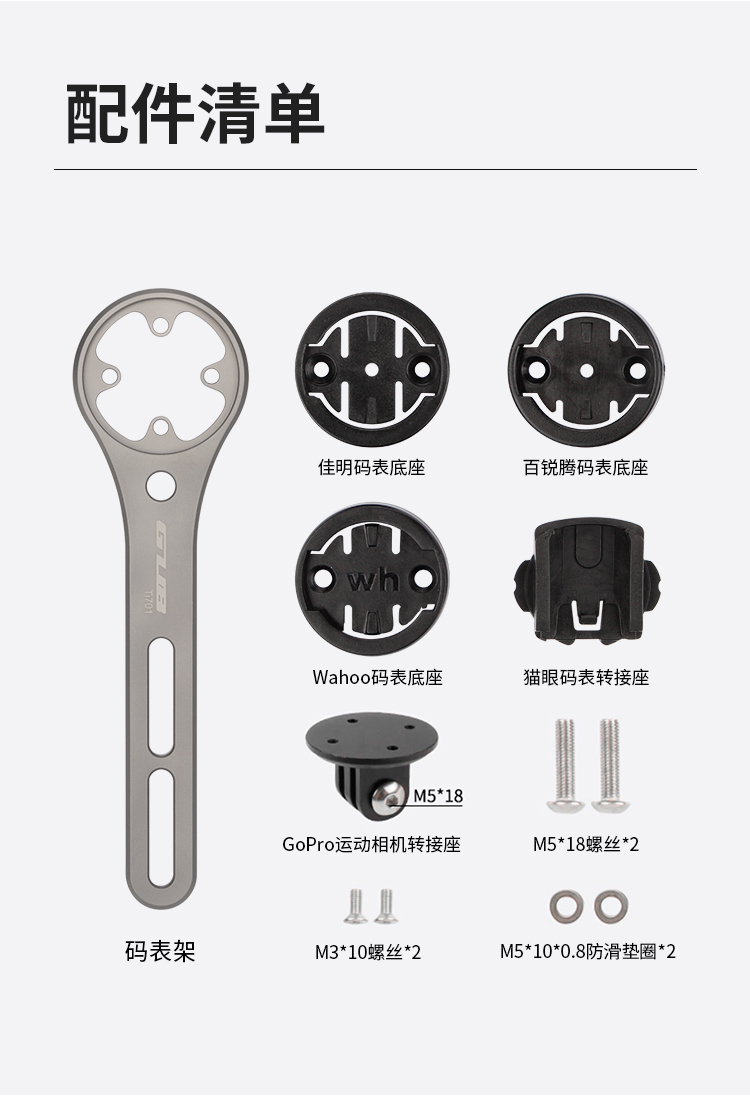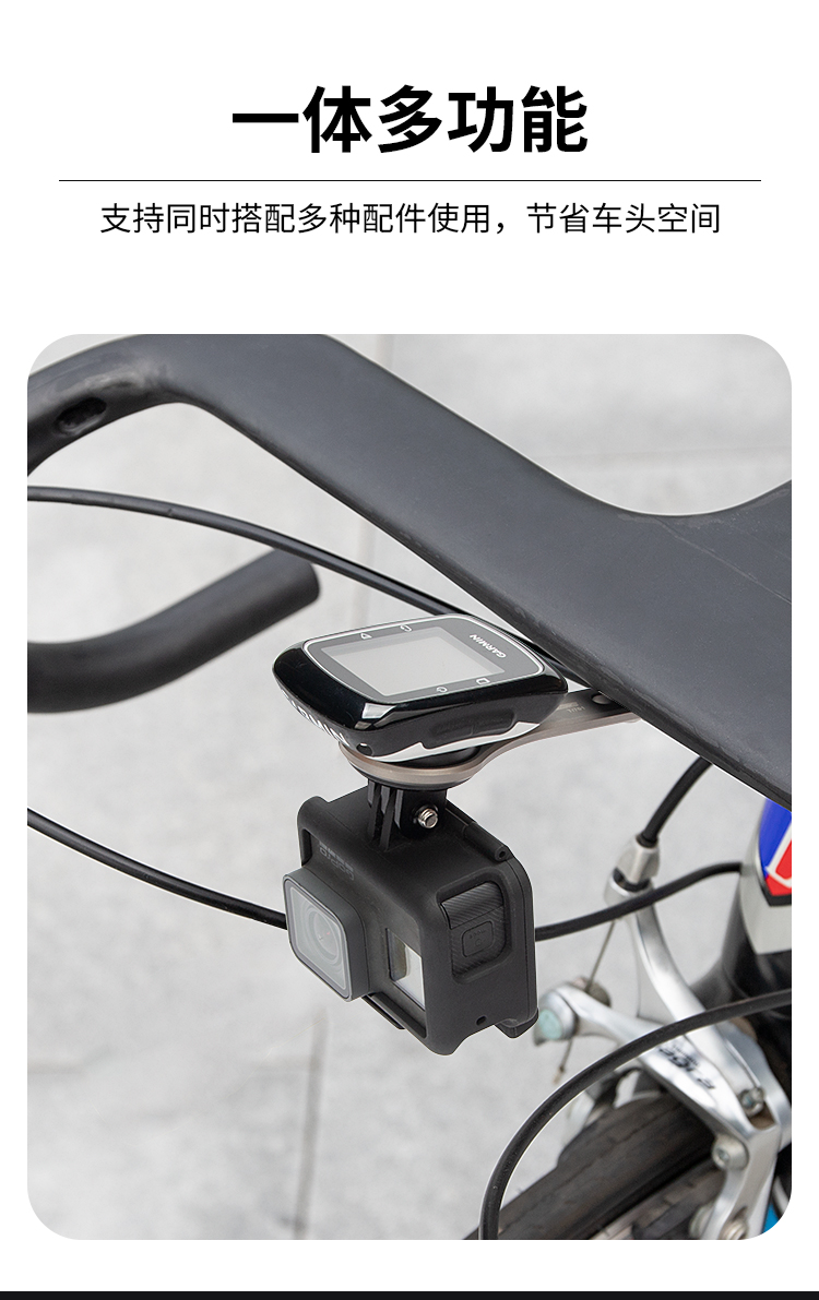 特點(diǎn):鈦合金架體,居中安裝節(jié)省空間(一體把專(zhuān)用),兼容多種碼表,標(biāo)配運(yùn)動(dòng)相機(jī)接座,可擴(kuò)展使用運(yùn)動(dòng)相機(jī)等配件