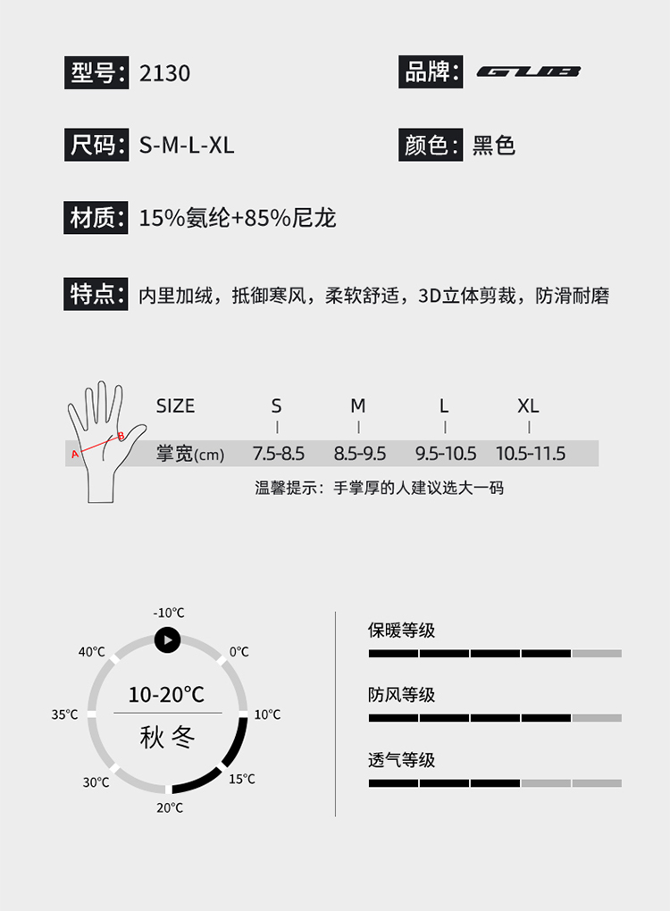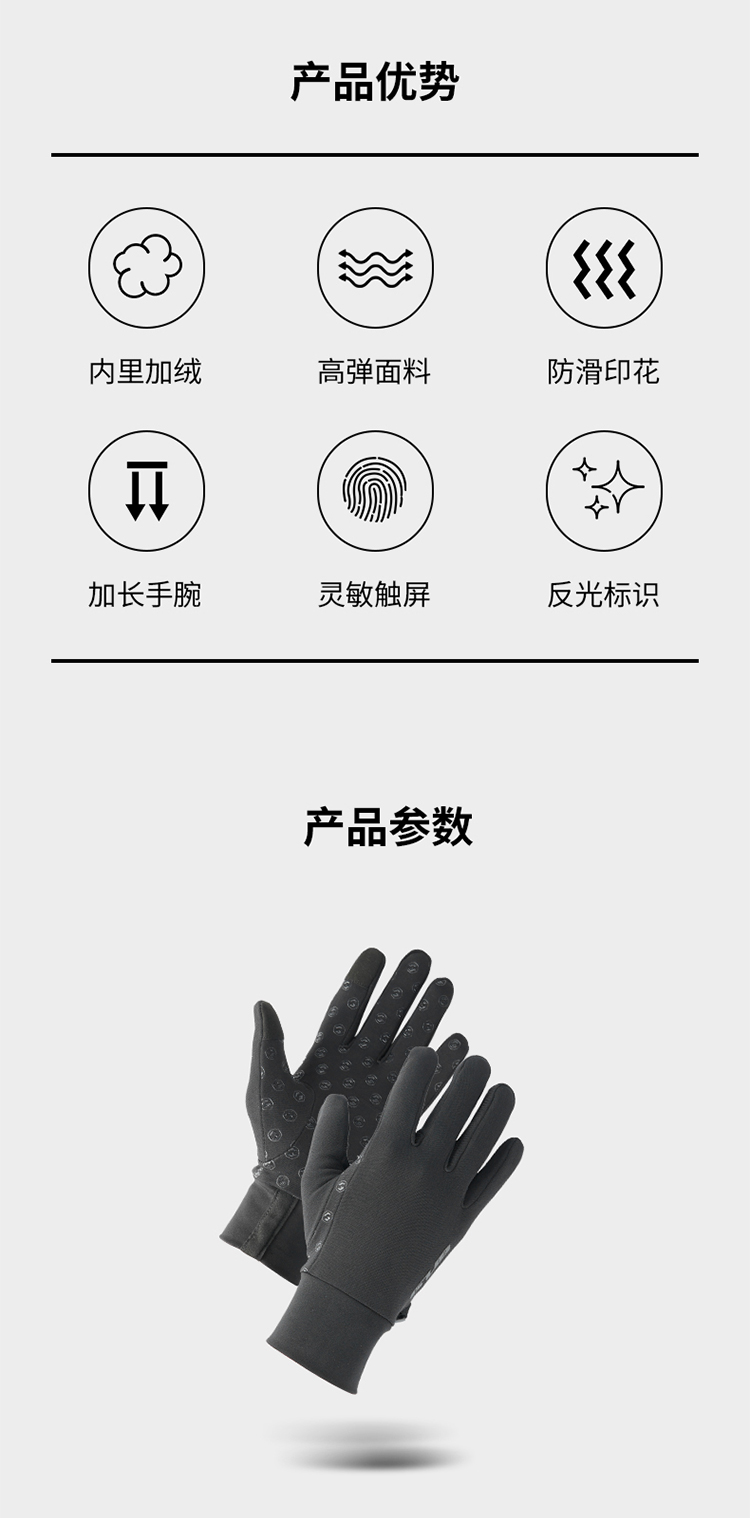 特點:內(nèi)里加絨,抵御寒風,柔軟舒適,3D立體裁剪,防滑耐磨,支持觸屏