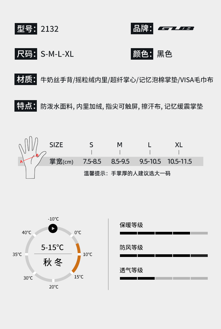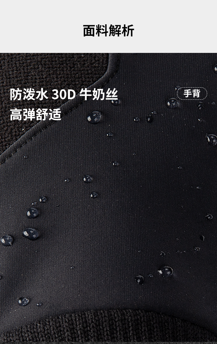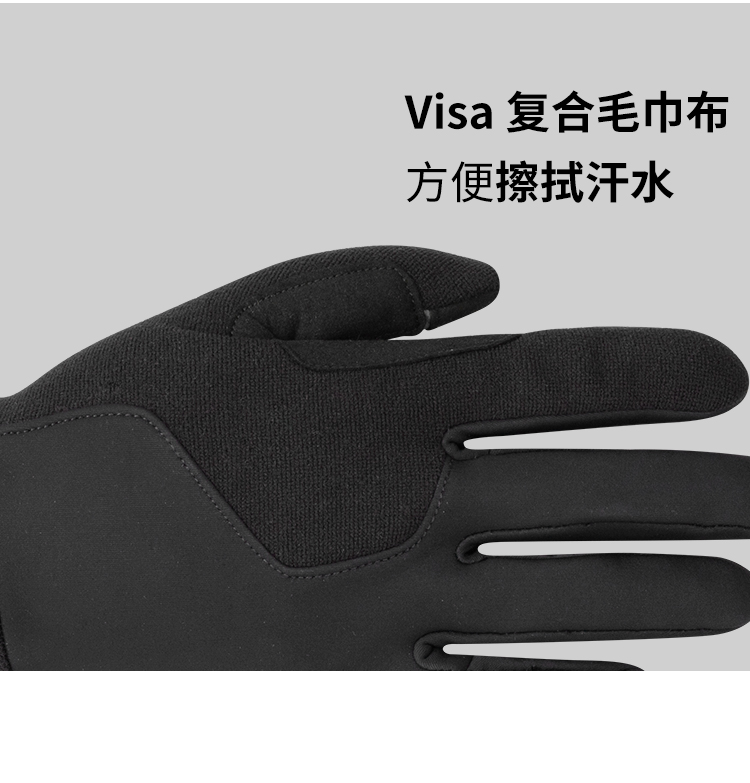 材質(zhì):30D牛奶絲手背、搖粒絨內(nèi)里、超纖手掌、3MM記憶掌墊、Visa擦汗布、拇指食指導(dǎo)電布