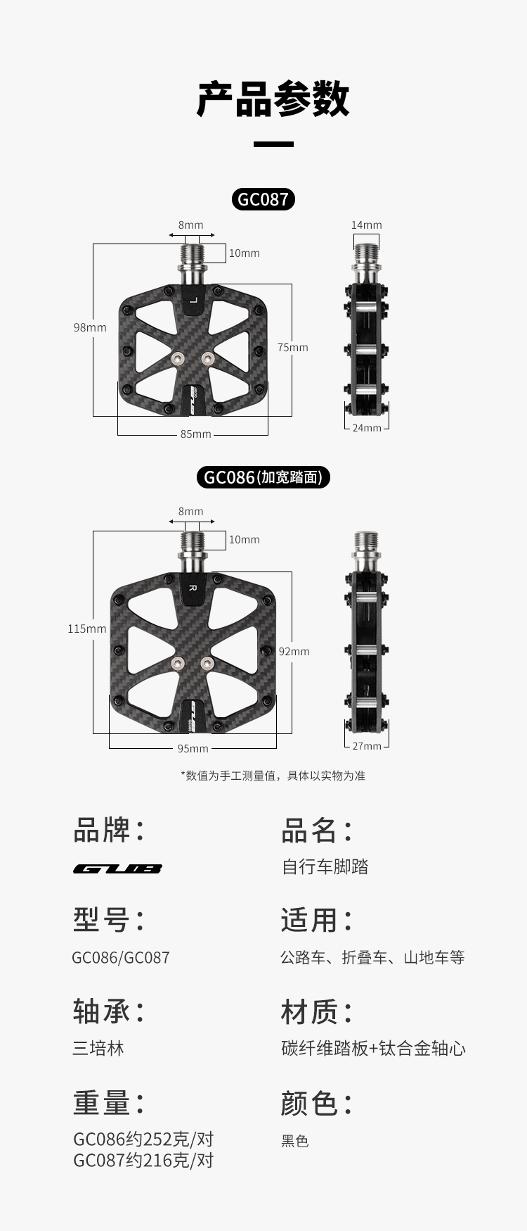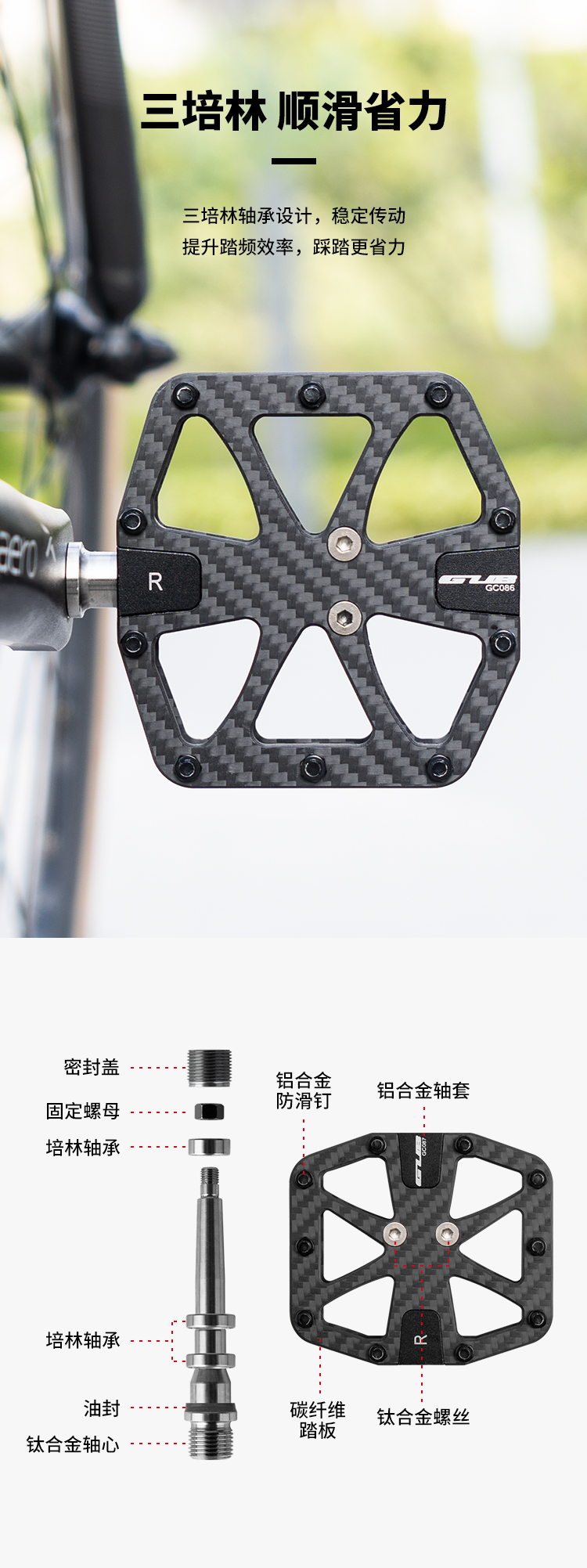 材質:碳纖維踏板+鋁合金軸套+鈦合金軸芯