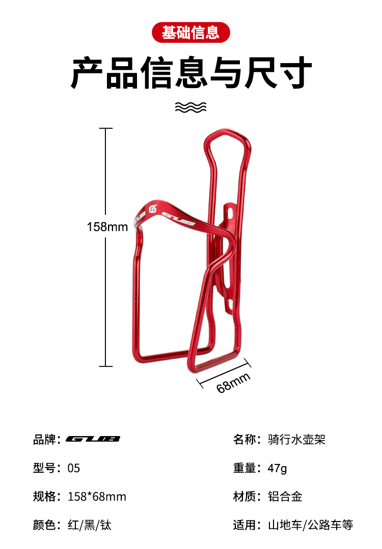 名稱:GUB 05 水壺架 材質(zhì):鋁合金 顏色:黑/紅/鈦 凈重:約47克 毛重:約69克